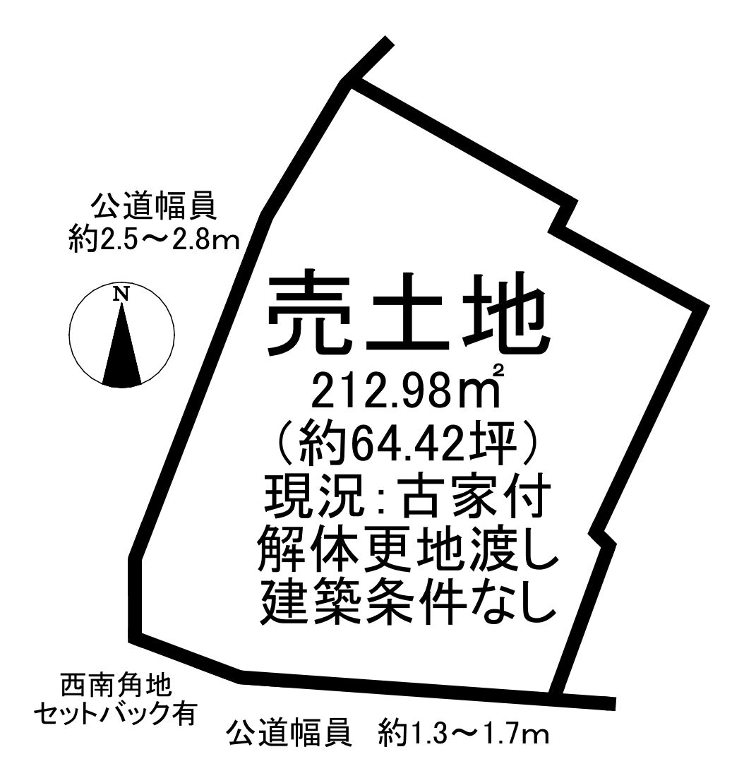 | 接道状況 | 西2.5m 公道 接面18.1m 南1.3m 公道 接面13.3m | ||