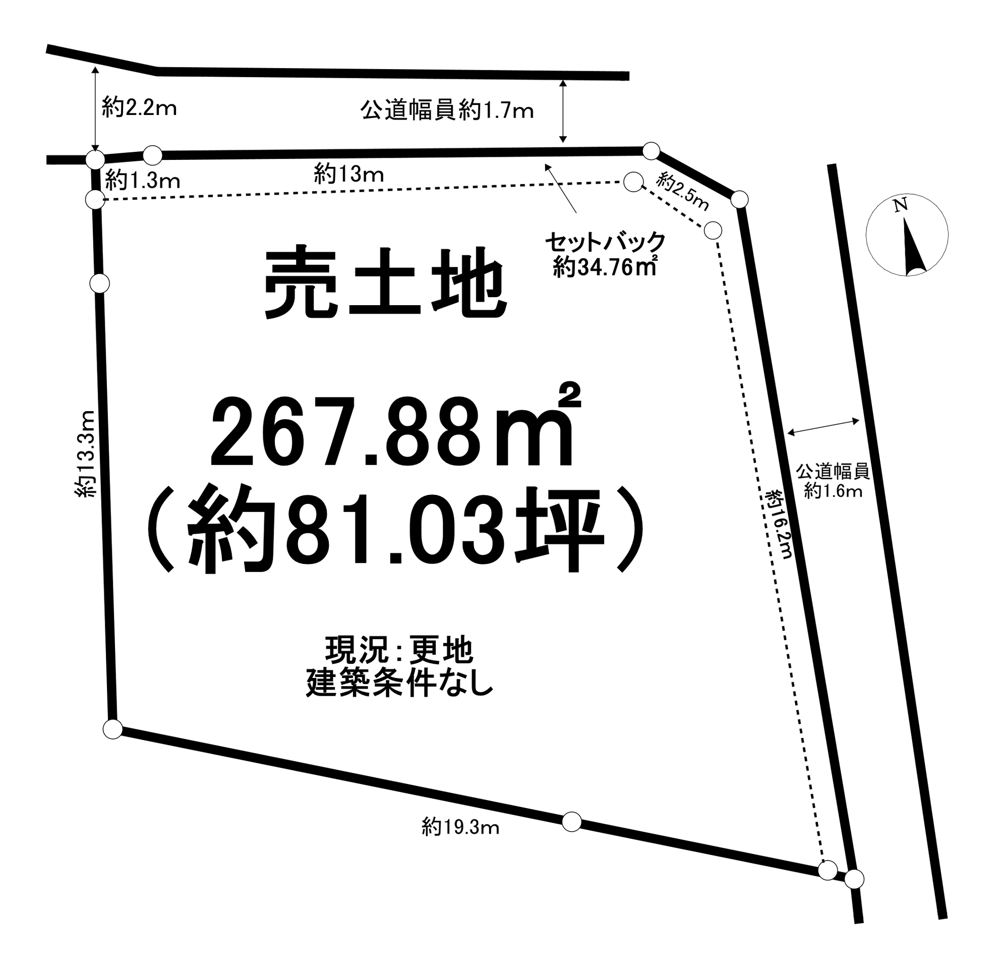 | 接道状況 | 東1.6m 公道 接面16.3m 北1.7m 公道 接面14.4m | ||