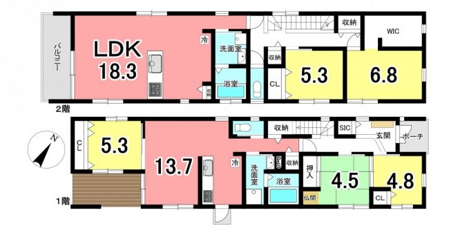開放感あふれるLDK: 2階には18.3畳の開放的なリビング、1階には13.7畳の寛ぎ空間をご用意 。