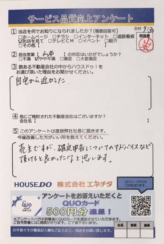 この度は数ある不動産会社の中からハウスドゥを選んでいただきありがとうございました。